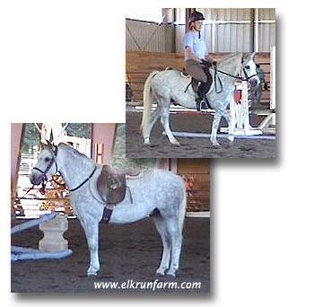2000 gelding pony, 12.0 h. This pony is light gray with one white sox. Very mellow and super nice hunter movement. Looks like a little horse! Now under Saddle--walk, trot, canter --- we are now jumping! Wonderful trot -- great little jumper -- really tucks up! Ties, clips, bathes, hauls -- great alone or with other horses. This horse is consigned to Elk Run Farm |