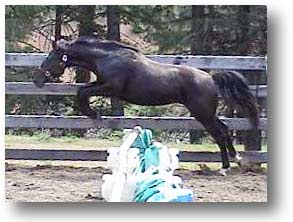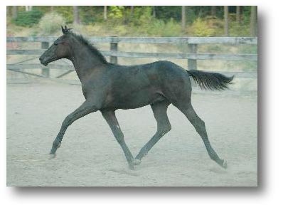 2002 black filly with a star and two hinds socks by Private Dancer (Pik Solo) Hanoverian out of Irina Swedish Warmblood mare (Eros), Both dressage and jumping lines. Stunning, leggy and already doing tempe changes! Currently standing 15.2 will mature 16.1-16.2 -- great mover. Will be started on lunge this spring. |