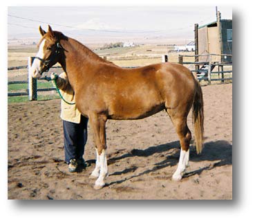 G-Man, Welsh Cob Sec D/Arab Gelding 2002 Registered 1/2 Welsh Cob Sec D/Arabian cross Sire is a 15 hand Arabian and dam is 14.2 hand Welsh Sec D cob. He stands 15 hands currently. Chestnut with 4 white anklets and a star - flashy. Beautiful mover. Currently starting training under saddle.